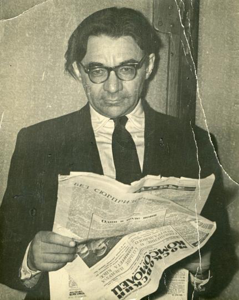 In the photograph Levitin is reading the Moscow Komsomol daily newspaper.