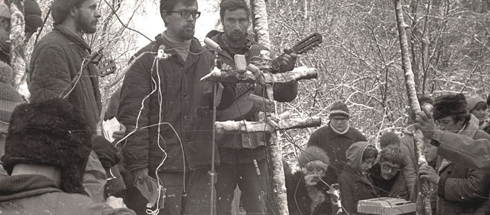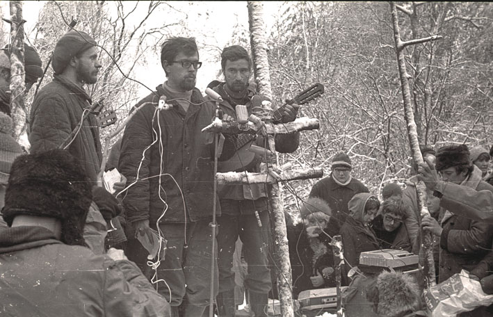 In 1975 the USC, whose numbers had increased to several thousand, broke up into ‘groups’; meetings of these groups were organized, out of which appeared (independently of the USC) the ‘Sundays’ — meetings of creative young people in the woods (CCE 41.13, CCE 42.9 [16]). Here Valery and his group performed sketches (Radishchev; ‘City of the Sun’ after Campanella) and programmes they had written themselves (‘The Man with the Kerosene Lamp’, ‘The Horse’).